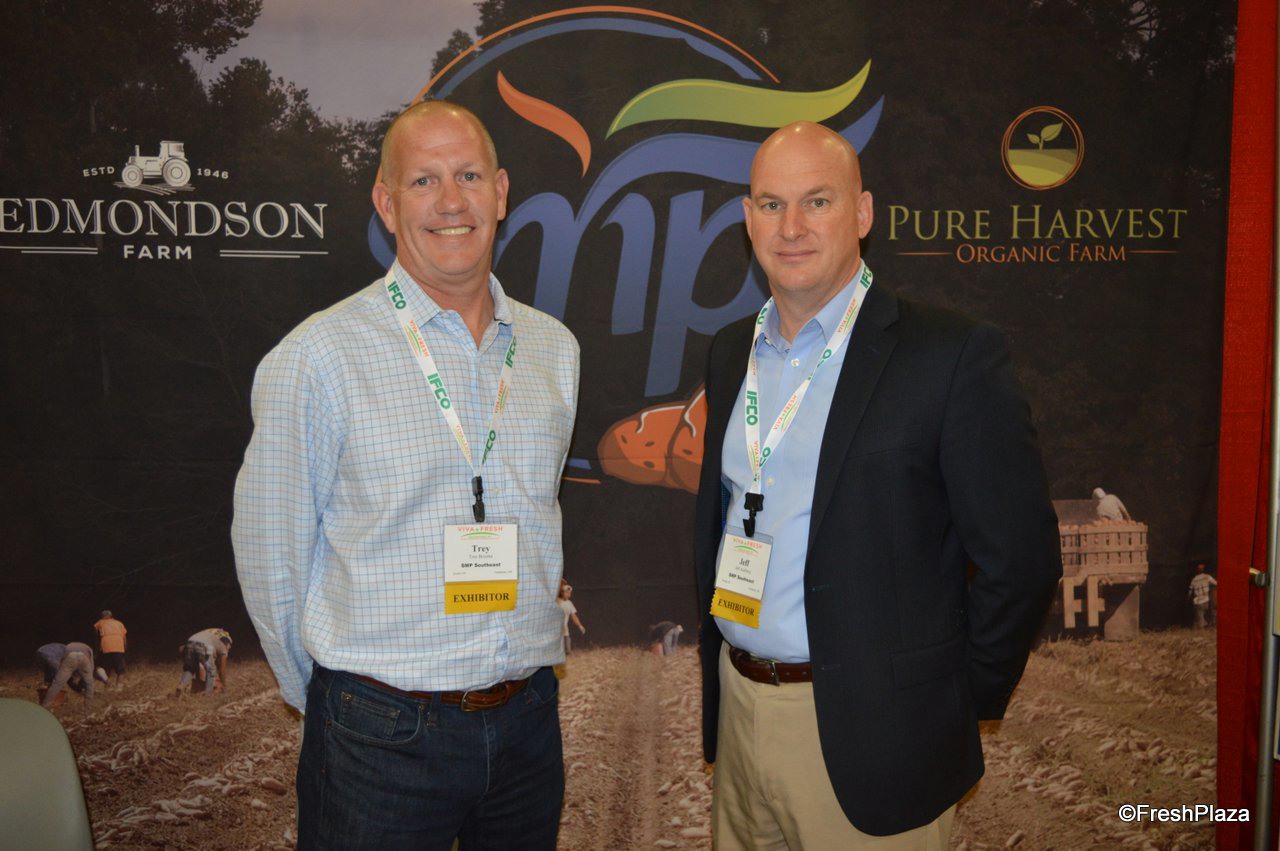 Trey Boyette and Jeff Axelberg with SMP Southeast Marketing, Inc. talk to customers about Mississippi-grown sweet potatoes.