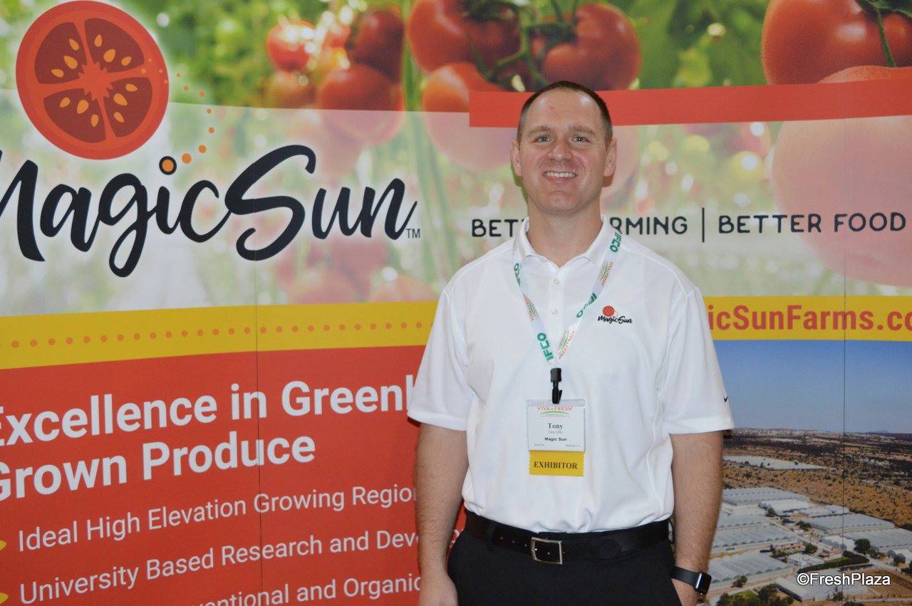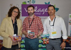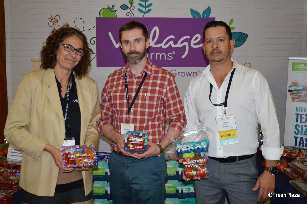 Lyra Vance, Brandon Jamison and Carlos Flores with Village Farms. Lyra shows chameleon tomato packaging. Brandon and Carlos show Texas-grown tomatoes with the packaging emphasizing the company’s Texas program.