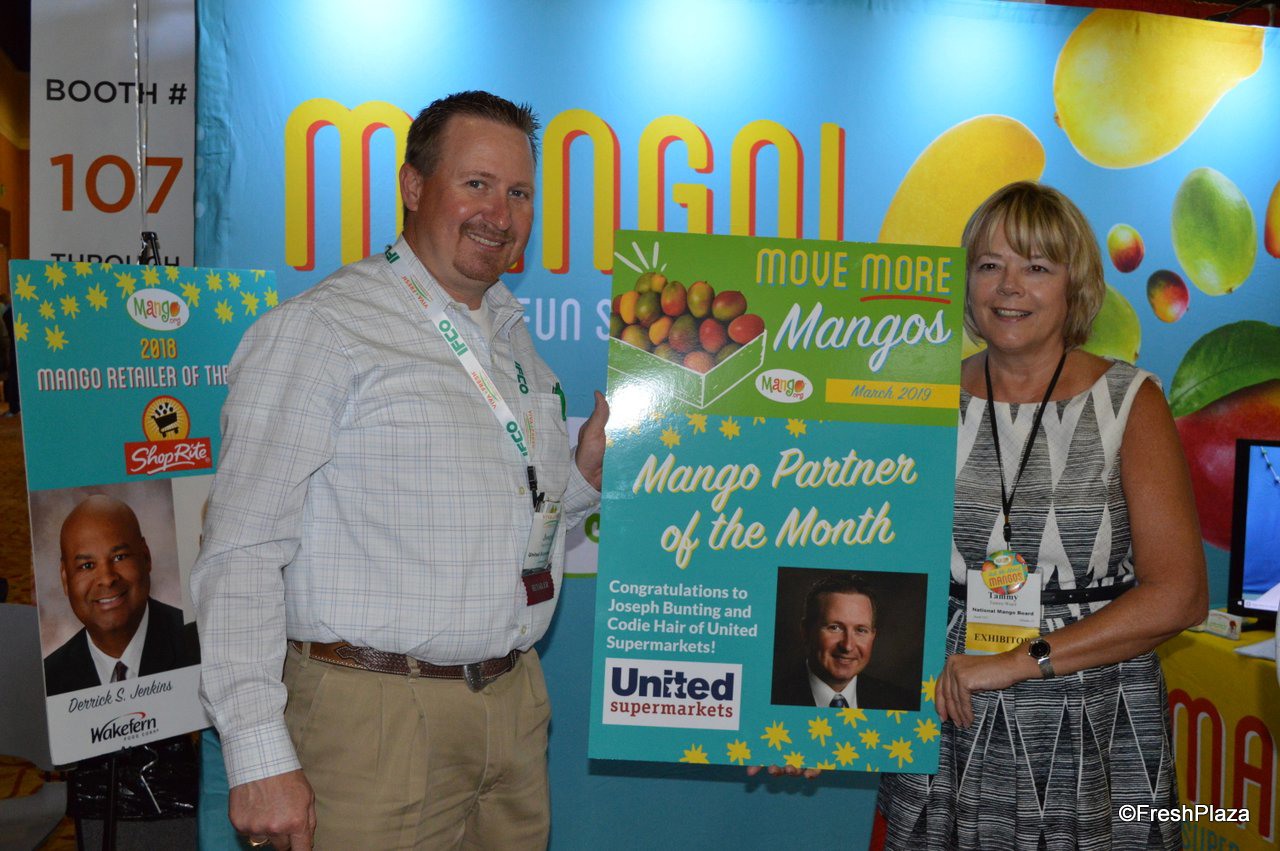 Joseph Bunting with The United Family of supermarkets and Tammy Wiard with the National Mango Board proudly show how Joseph was Retail Mango Partner of the Month March.