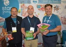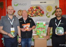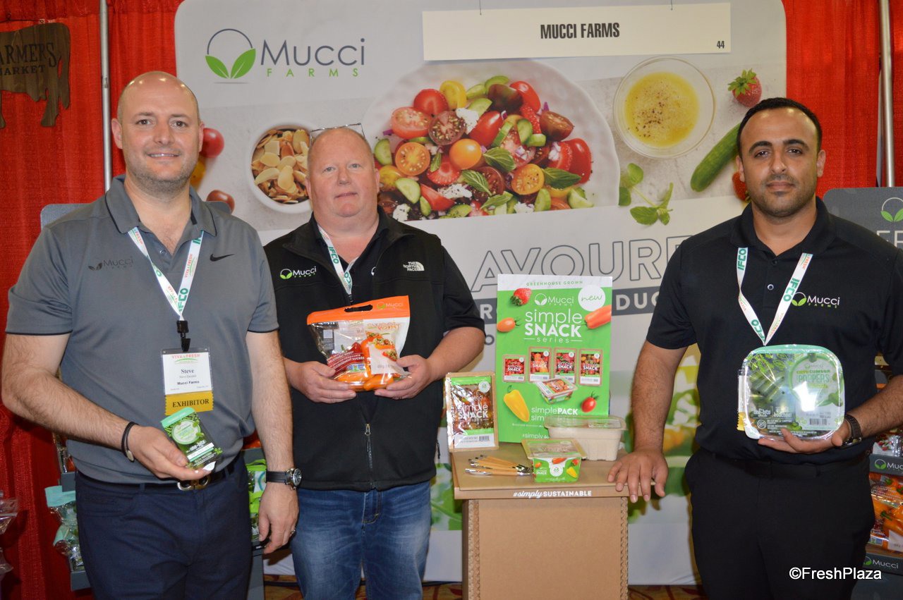 Steve Zaccardi, Rob Medcalf and Majid Radam with Mucci Farms show cucumber poppers and snackable sweet peppers.