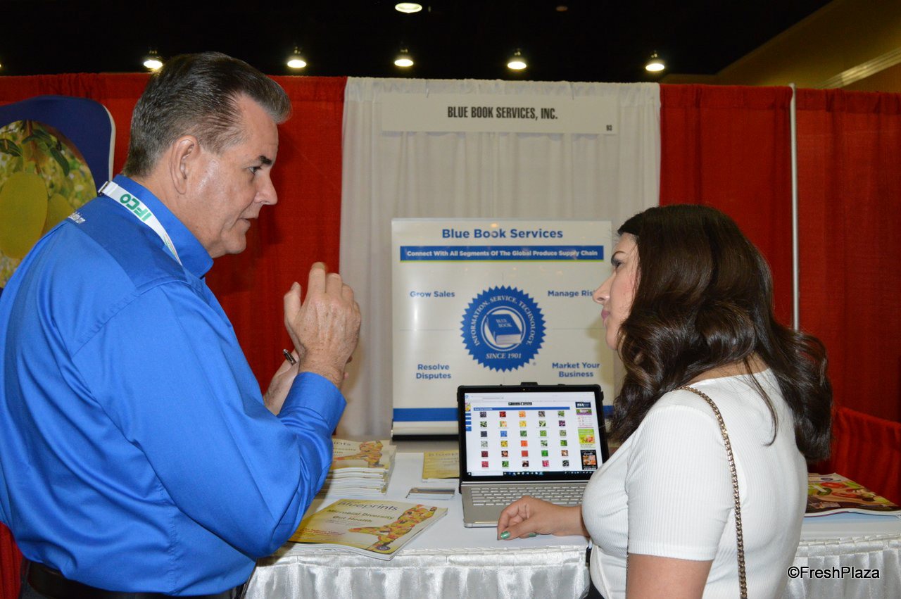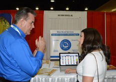 Frank Sanchez with Blue Book Services is talking to a customer and explaining more about the company’s database that provides credit and marketing information.