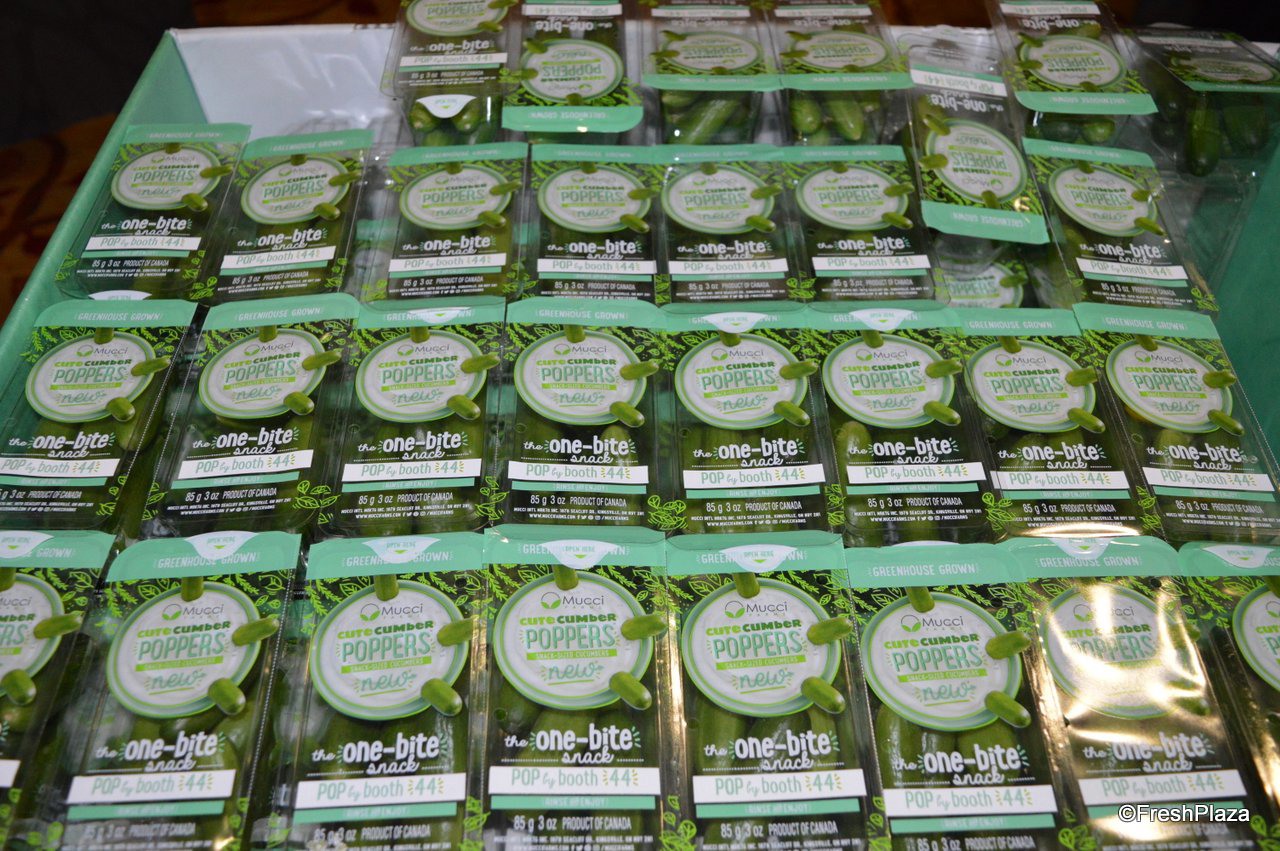 3 oz. cucumber poppers on display at the booth of Mucci Farms. This size was developed for the Viva Fresh show.