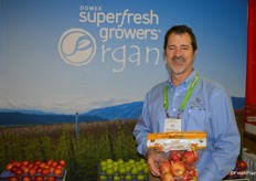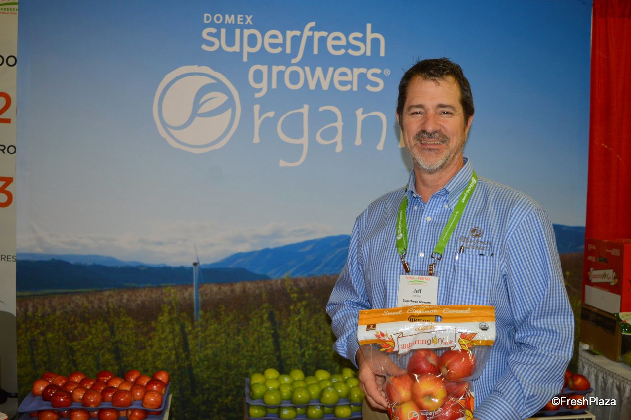 Jeff Ritts with Superfresh Growers shows a pouch bag of organic Autumn Glory apples.