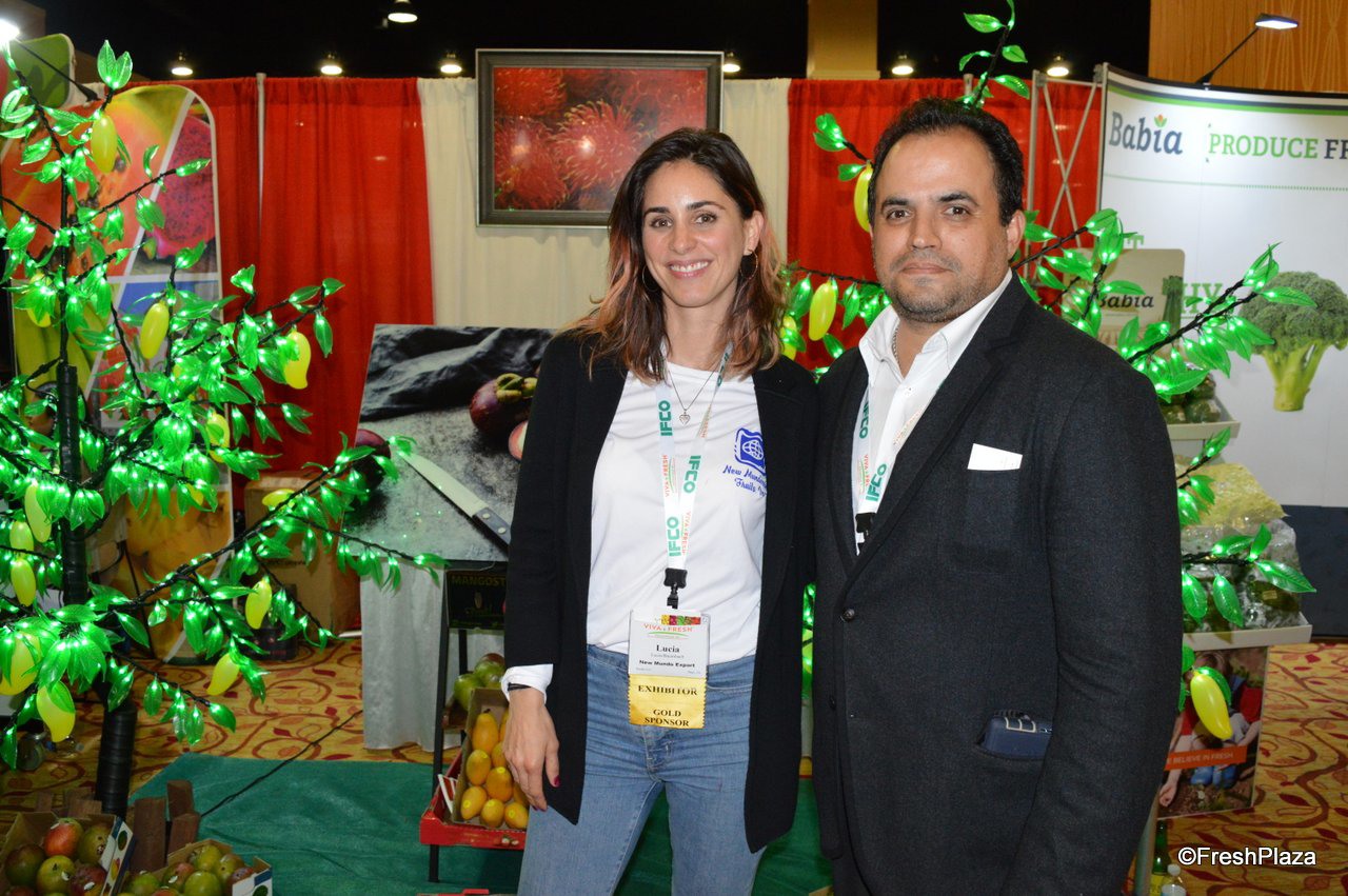 Lucia Baumbach and Cesar Garcia with New Mundo Export not only have mangos on display, but even mango trees.
