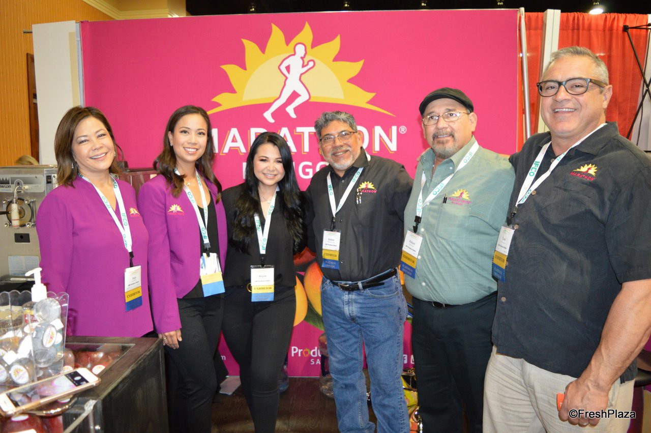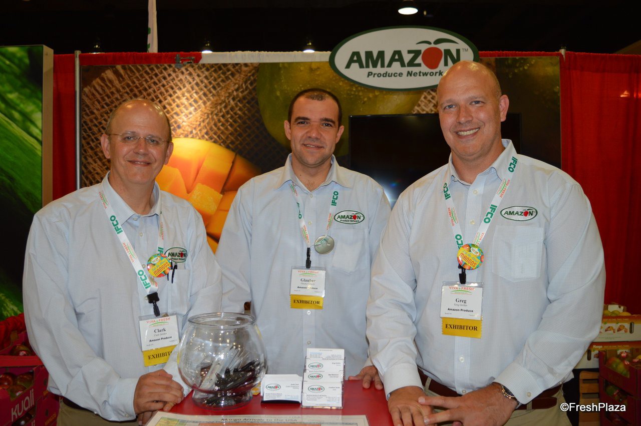 Clark Golden, Glauber Silva and Greg Golden with Amazon Produce Network with lots of mangos on display in the booth.