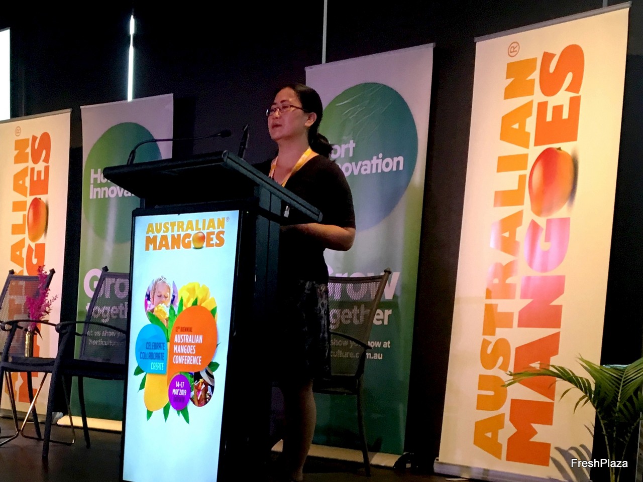 Dr Lucy Tran-Nguyen delivering a presentation on identifying and understanding factors that cause Resin Canal Discoloration in mangoes.