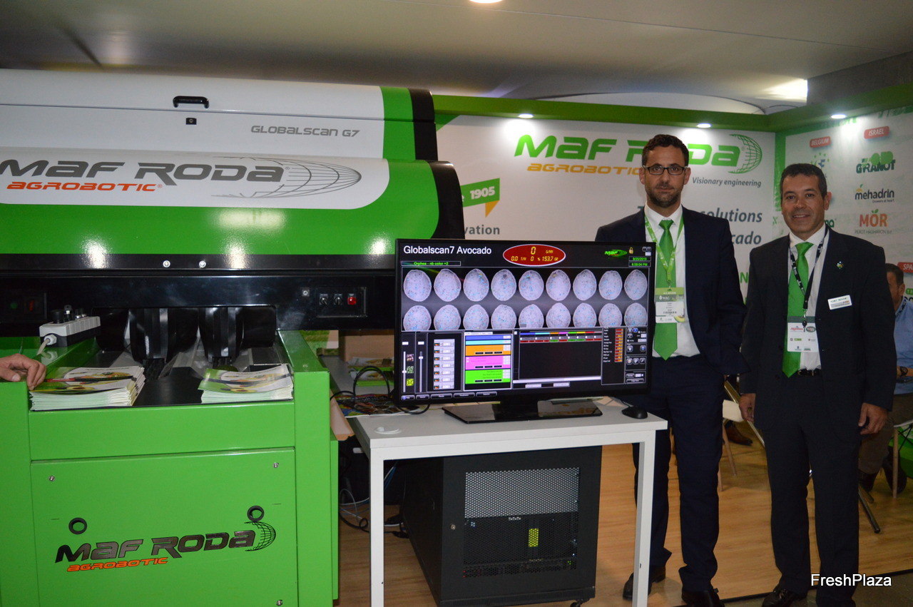 Maf Roda brought the Global Scan G7 to the event, it measures the external quality of avocados and can be adapted for other fruits. Didier Izard and Pedro Fernandez.