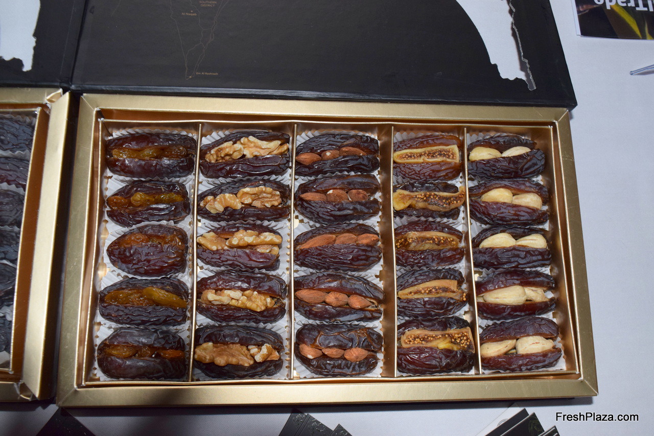Pure Palestine works with special presentations for their dates. This packaging includes raisin-stuffed dates, walnut-stuffed dates, almond-stuffed dates, fig-stuffed dates, and cashew-stuffed dates. The company also offers chocolate-covered dates.