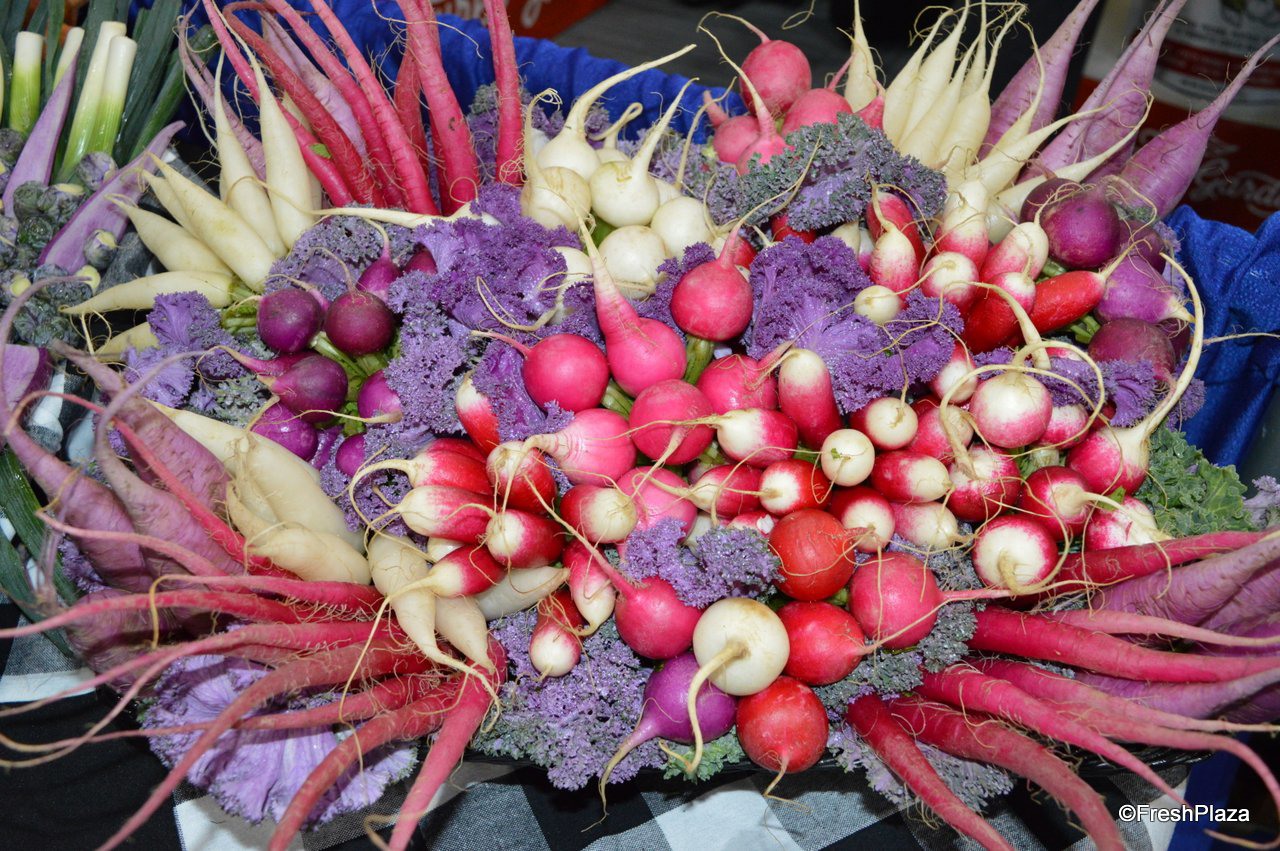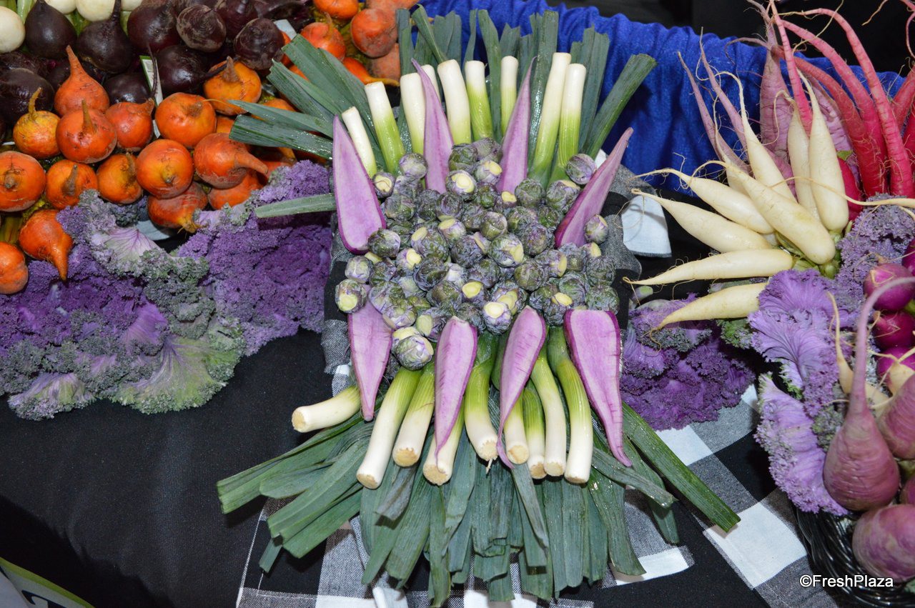 Beautiful display of purple Brussels sprouts, purple radish and baby leeks at the Babe Farms booth.