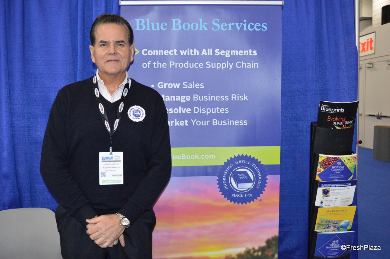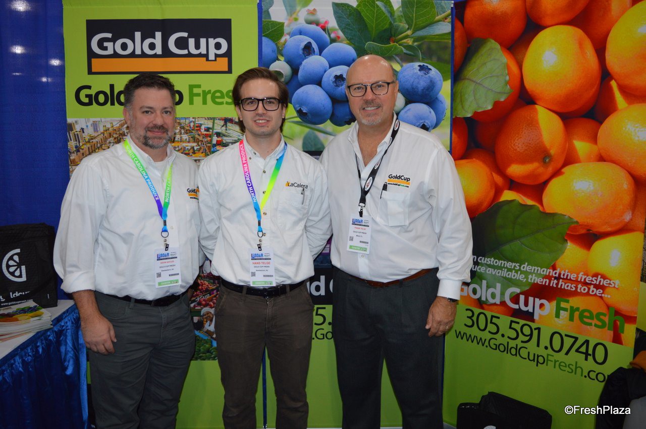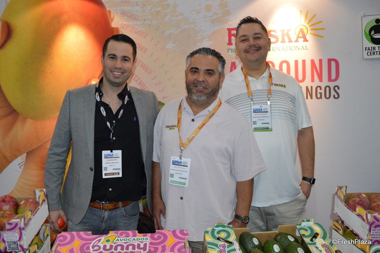 Luis Orrantia with Tropical Specialists on the left is visiting the booth of Freska Produce International. Jesus "Chuy" Loza and Jose Juan Rodriguez are on the right.