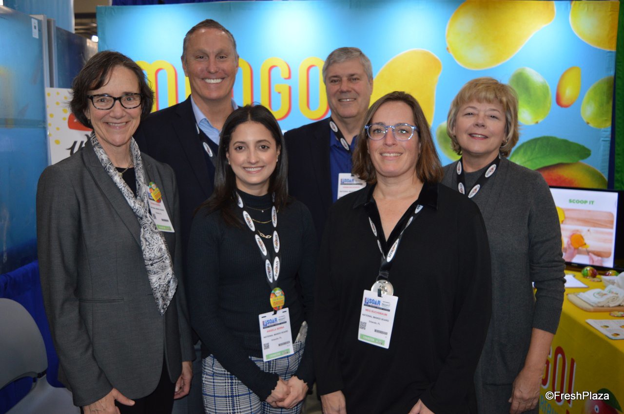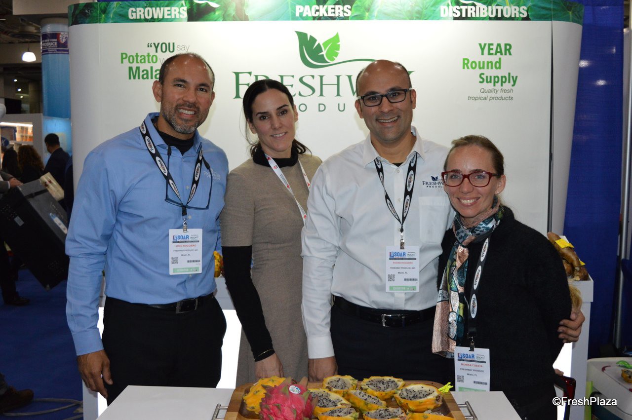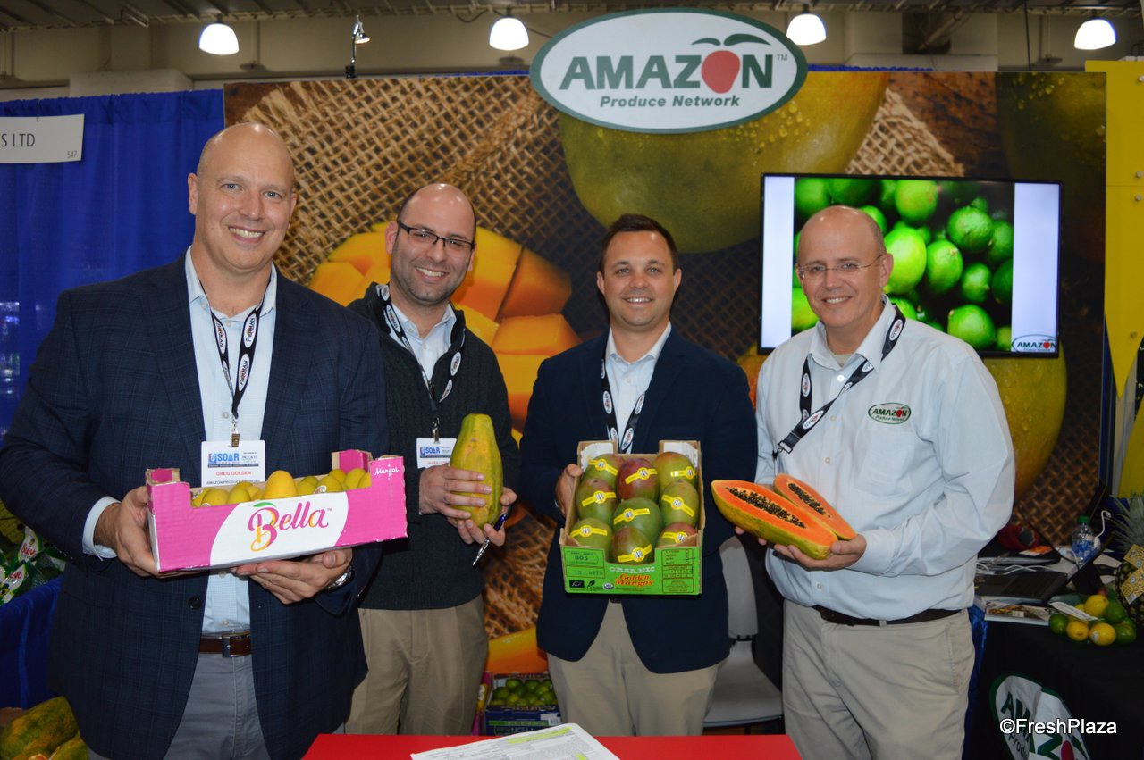 The team of Amazon Produce Network proudly show a selection of tropical items they brought to the show: Honey mangos, a Tianung papaya from Guatemala and a box of organic Kent mangos from Ecuador. From left to right are Greg Golden, Javier Leon, Matt Matalucci and Clark Golden.