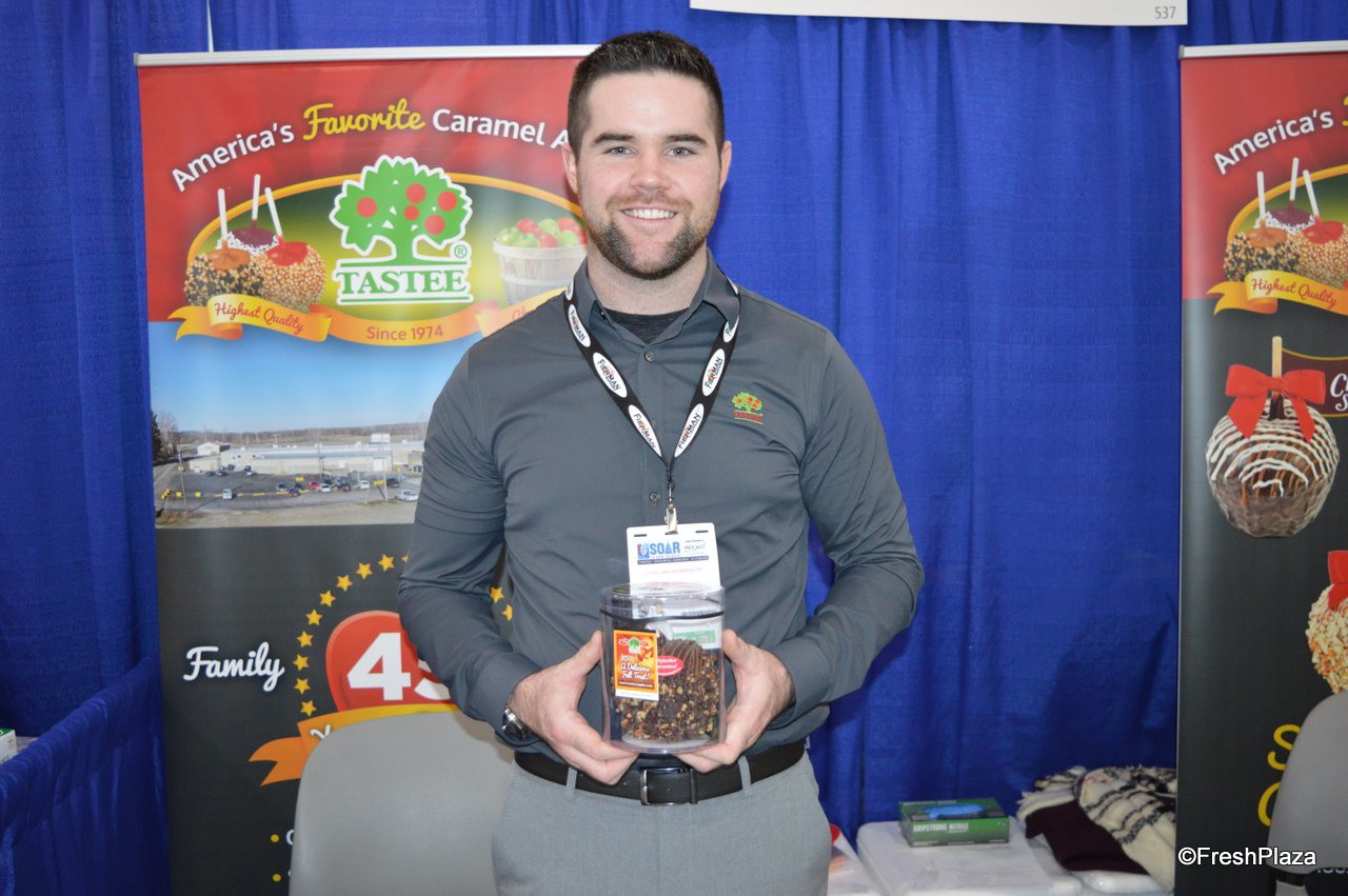Chad Hackenbracht with Tastee Apples shows one of the company's bestsellers: an apples dipped caramel, dipped in dark chocolate, rolled in pecans and drizzled with milk chocolate.