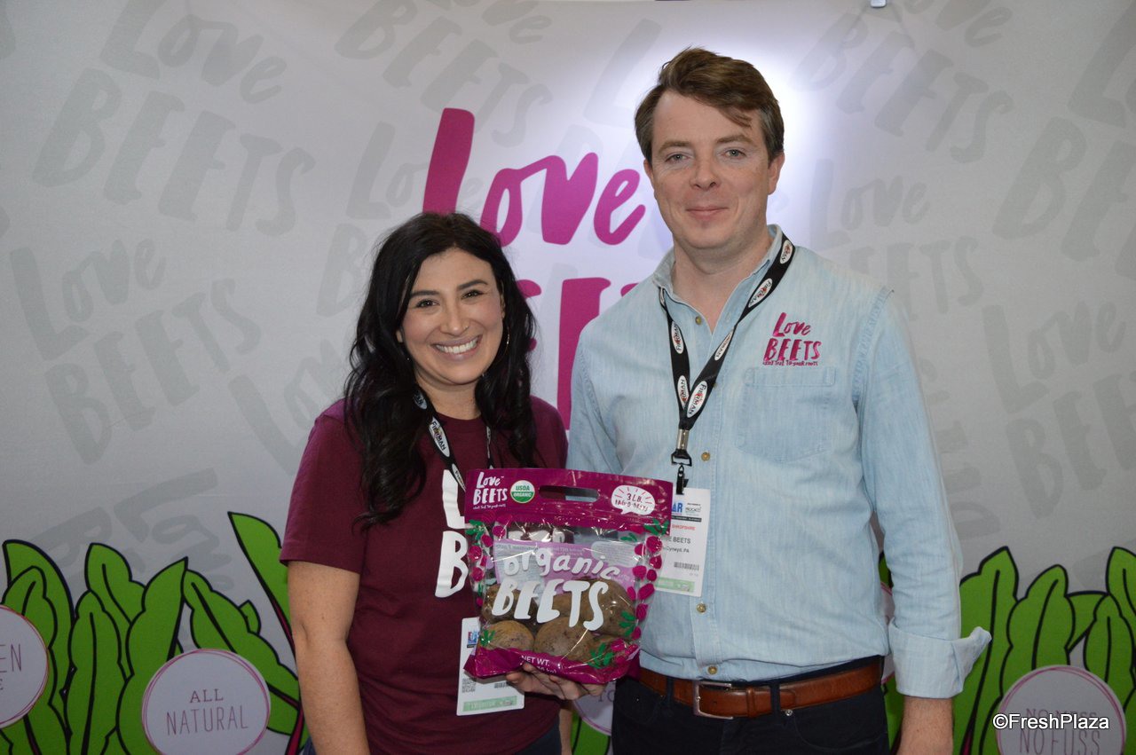 Abbie Phillips and George Shropshire with Love Beets proudly show the company's latest product: organic beets in a 2 lb. or 3 lb. pouch bag. They will be available as of January.