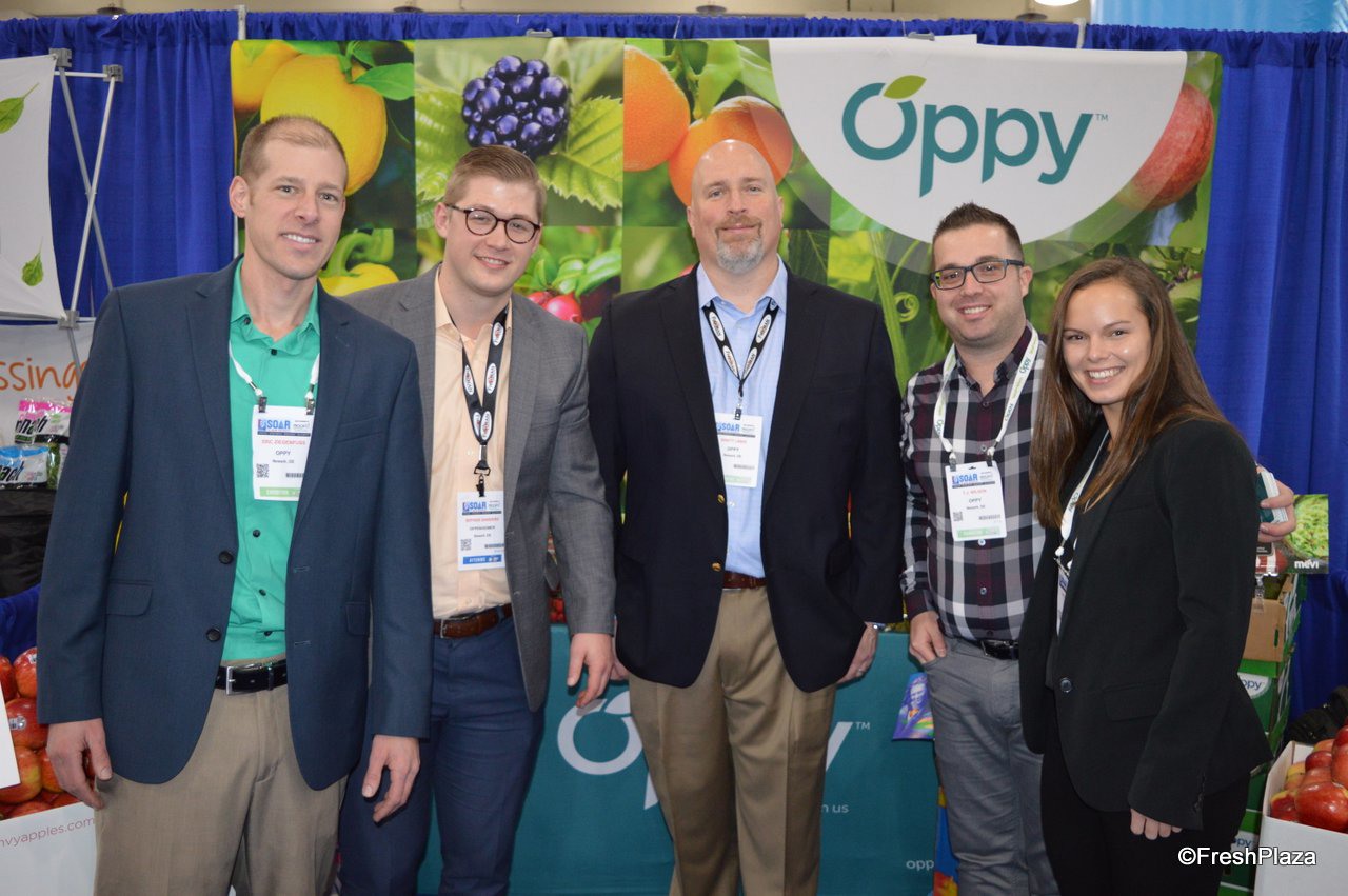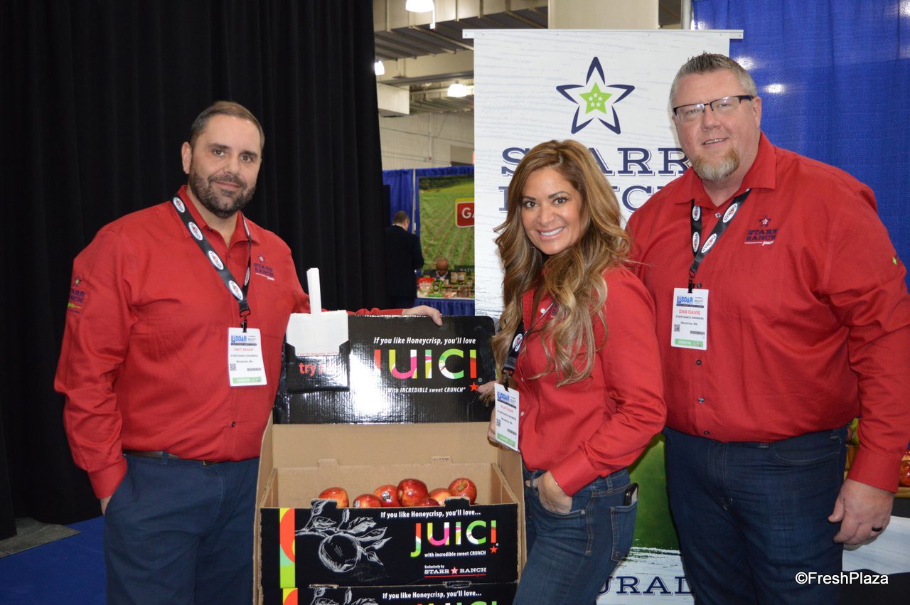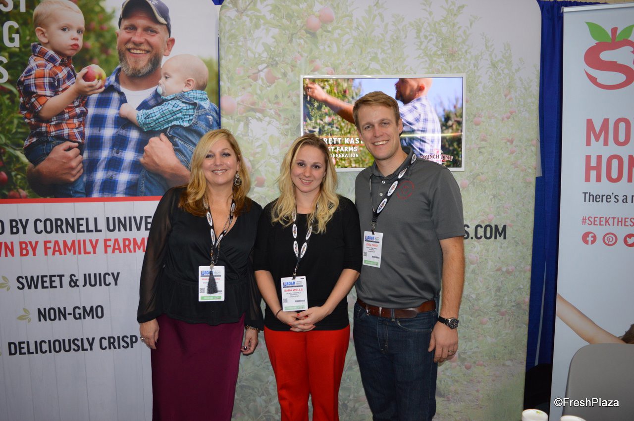Brett Reasor, Ellie Tucker and Dan Davis with Starr Ranch Growers by the company's Juici apple display. The Juici apple was very popular by show attendees. According to Davis, the response was overwhelming.