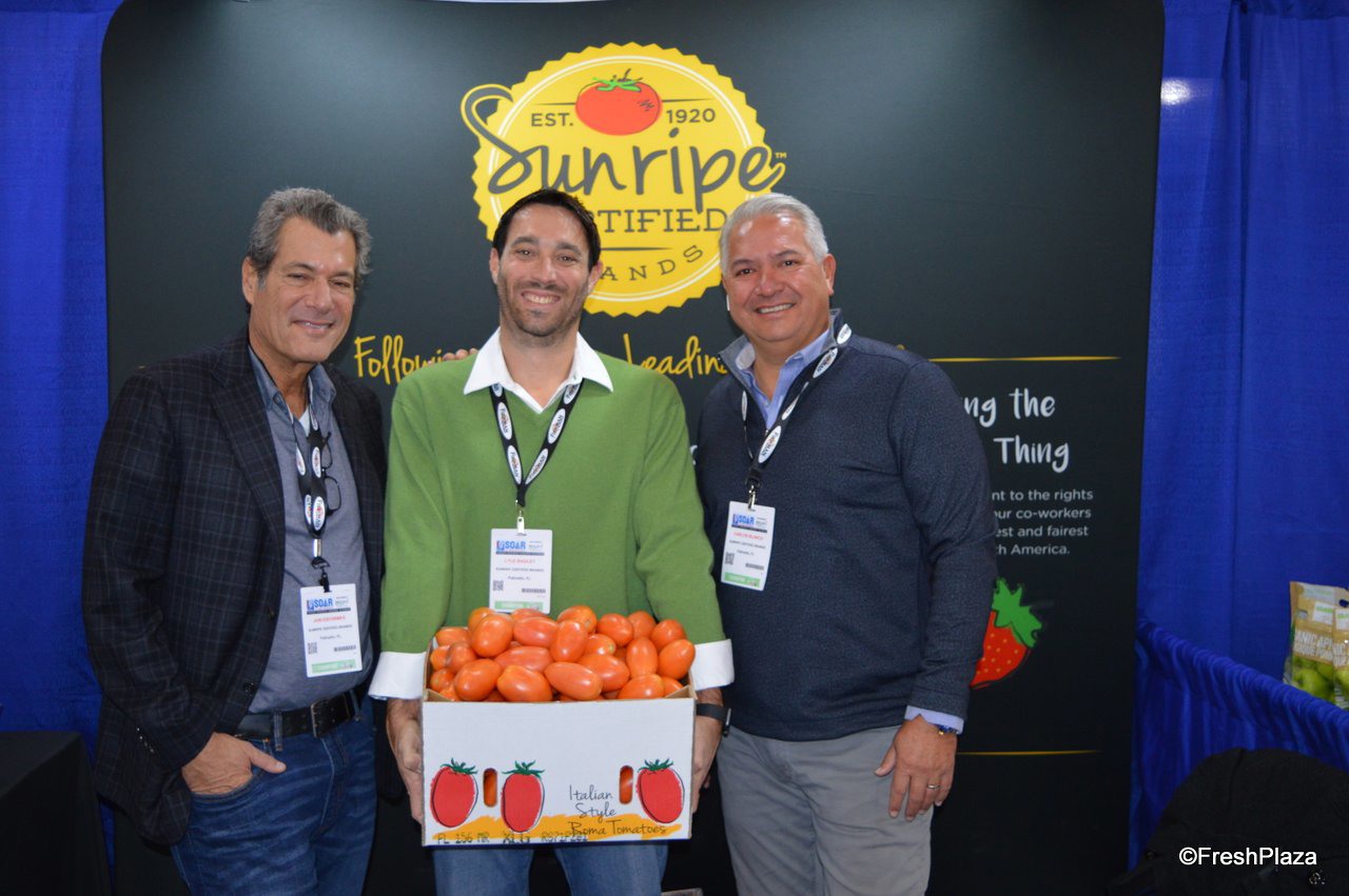 Jon Esformes, Lyle Bagley and Carlos Blanco with Sunripe Certified Brands. Lyle proudly shows a box of Italian style Roma tomatoes.