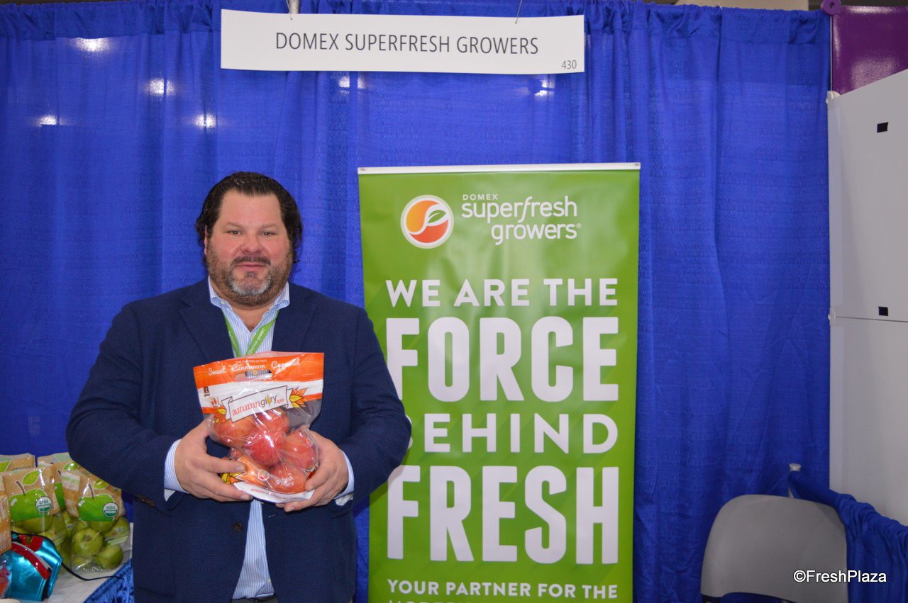 Paul Newstead with Domex Superfresh Growers shows a pouch bag of Autumn Glory apples.