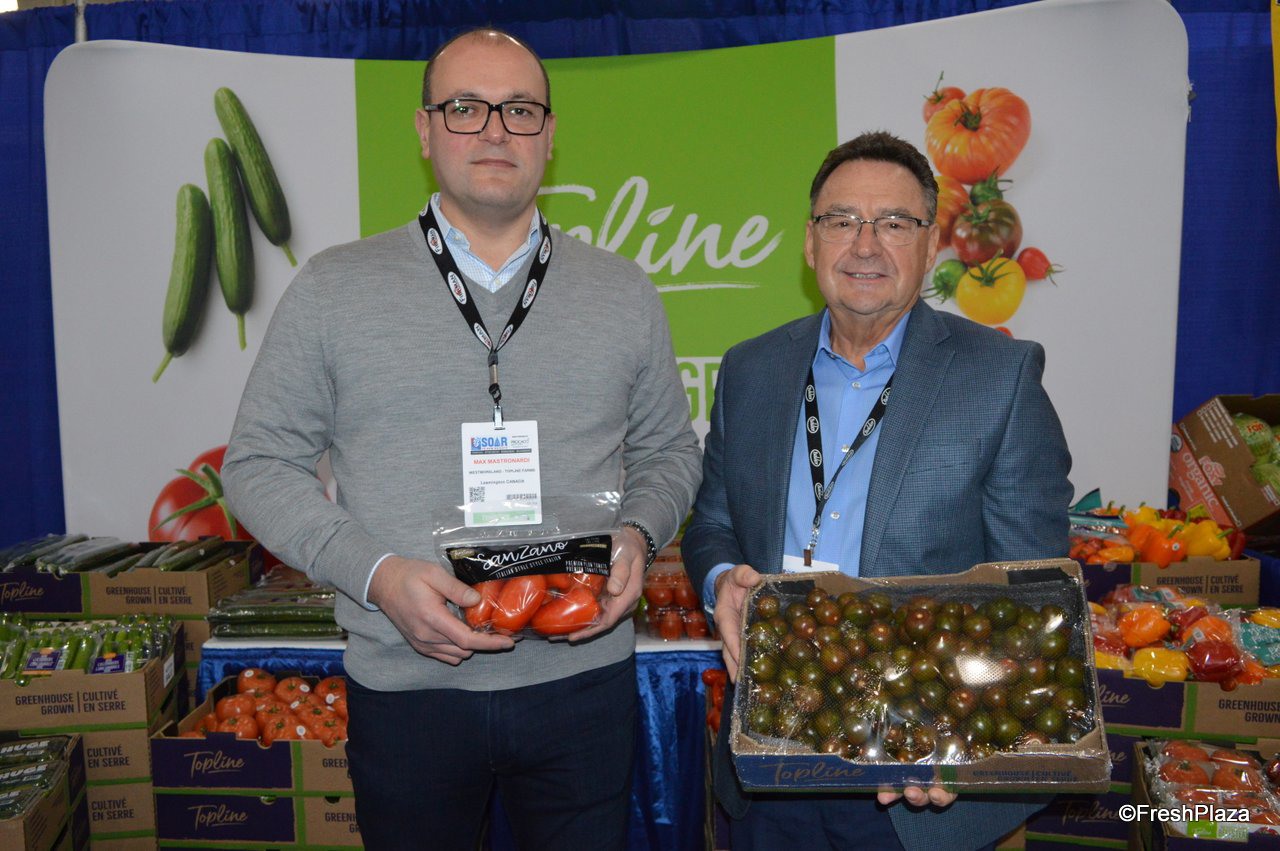 Max Mastronardi and Ken Green with Westmoreland - TopLine Farms show two new products. San Zano Roma tomatoes in pouch bags and Brown cocktail tomatoes for the foodservice segment.