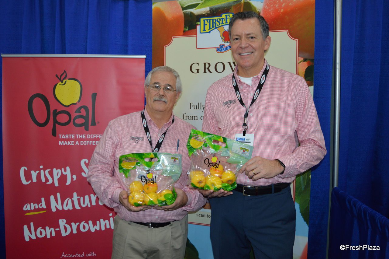 Dennis Jackson and Tim Cavanaugh with FirstFruits Marketing show pouch bags with Opal apples.