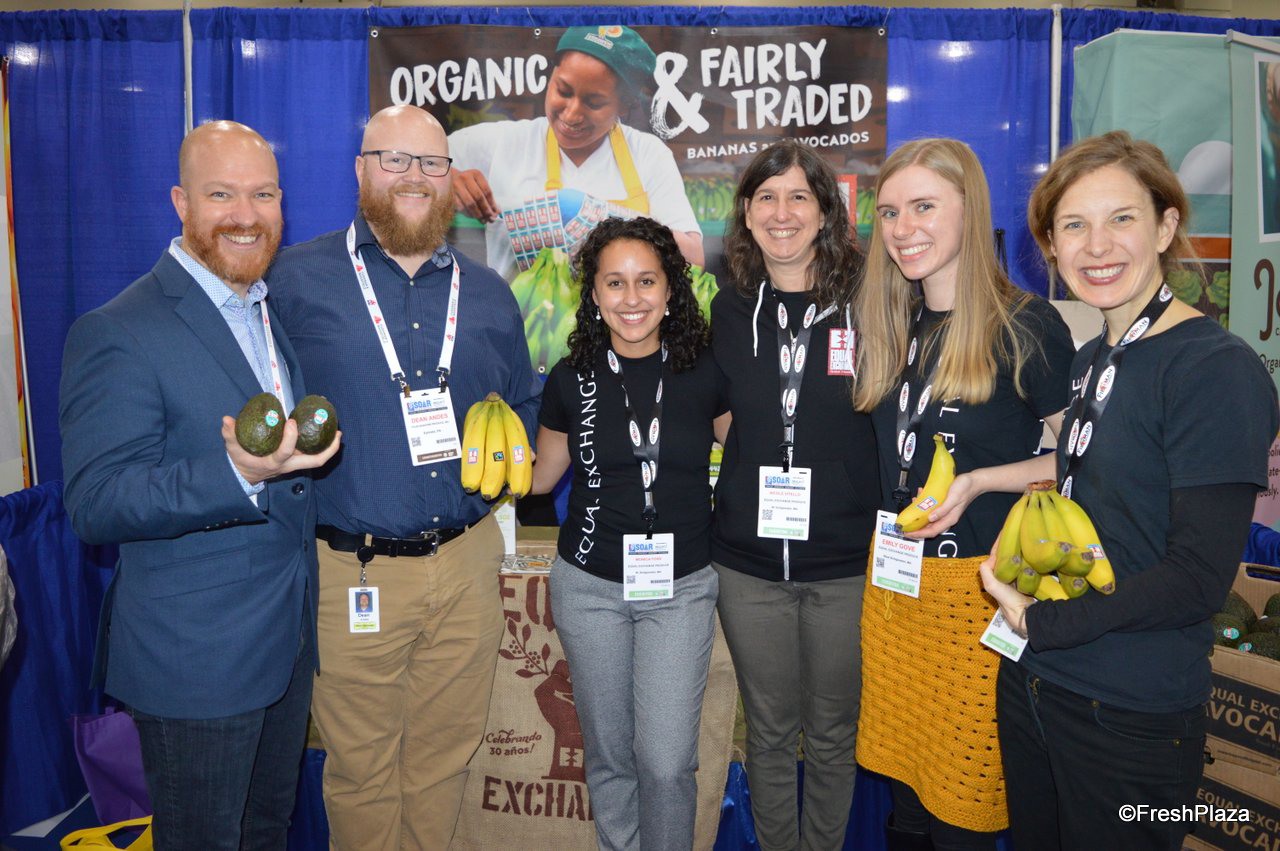 The ladies of Equal Exchange proudly smile for a picture with two gentlemen of Four Seasons Produce, who buy avocados and bananas from them.