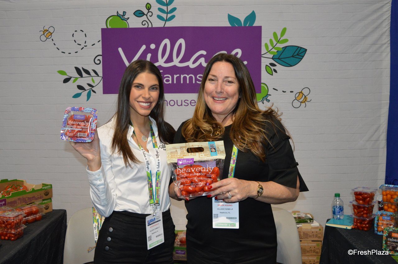 Krysten DeGiglio and Helen Aquino with Village Farms show heavenly villagio marzano tomatoes in different packaging formats.