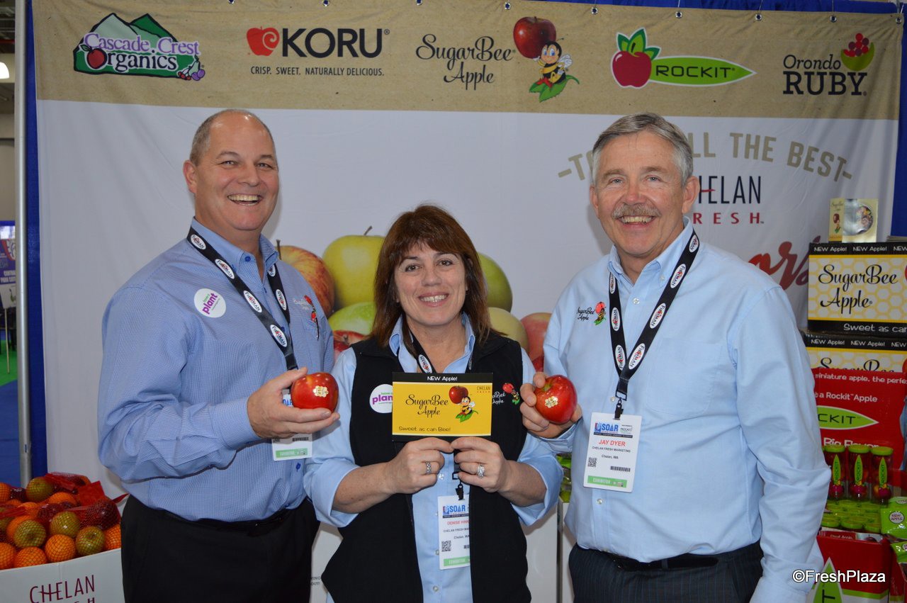 Mac Riggan, Denise Hinkley and Jay Dyer with Chelan Fresh proudly show the SugarBee apple.