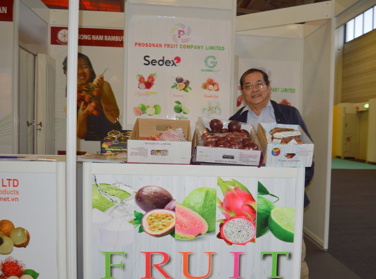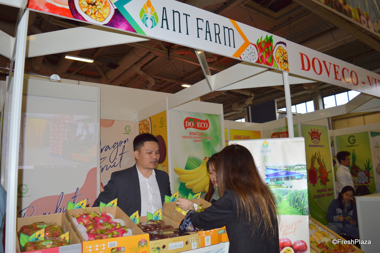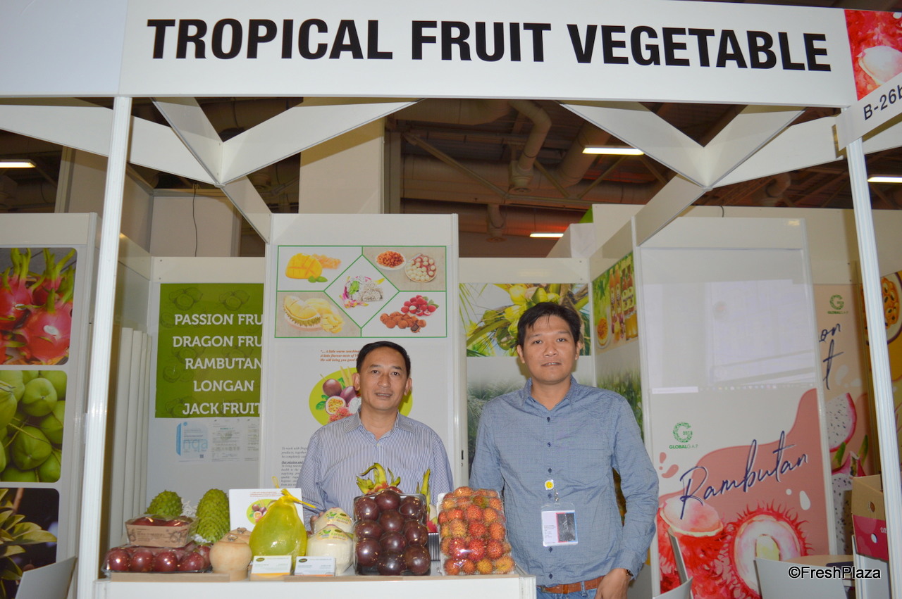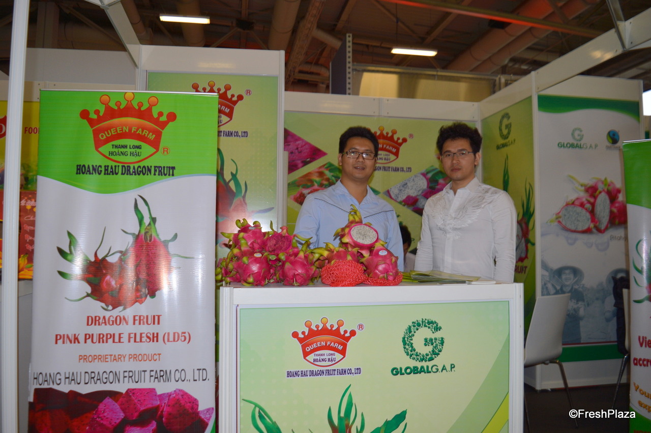 Hoang Hau Dragon Fruit Farm Co., Ltd exports a variety of fresh fruits from Vietnam, The Marketing Manager Mr Tran Ngoc Han (left) and his colleague are at the booth with their product display.