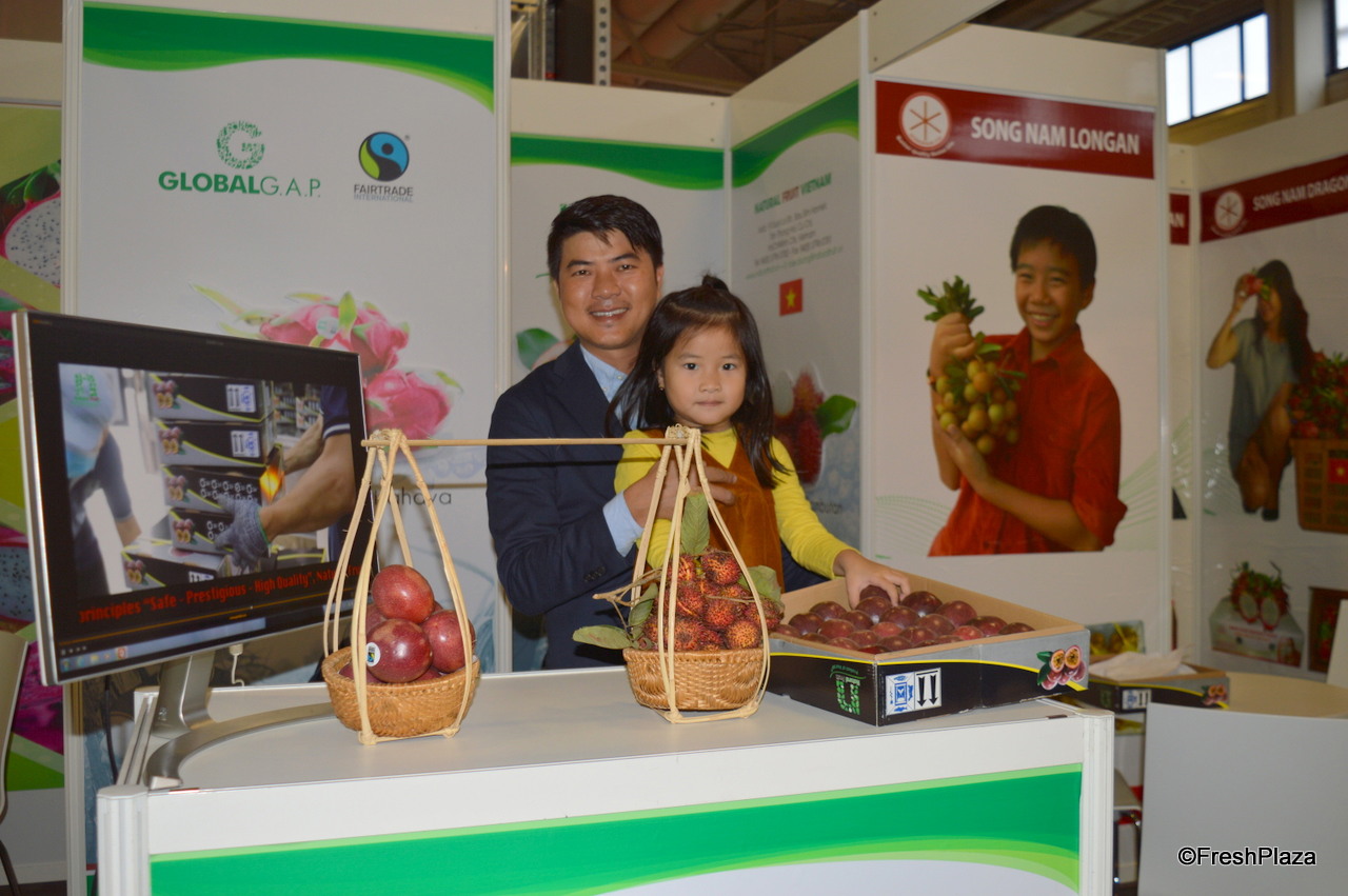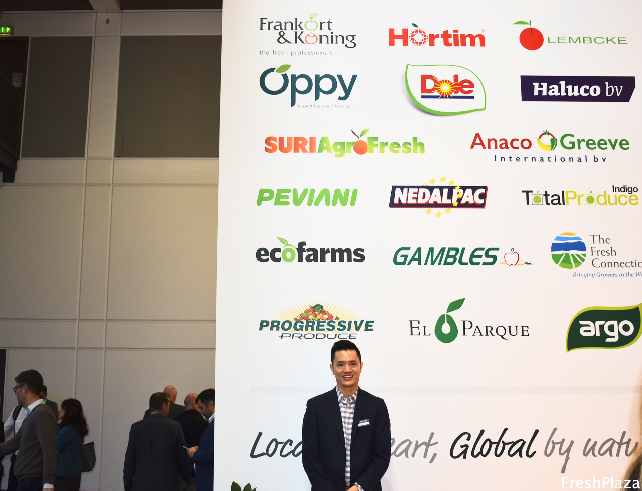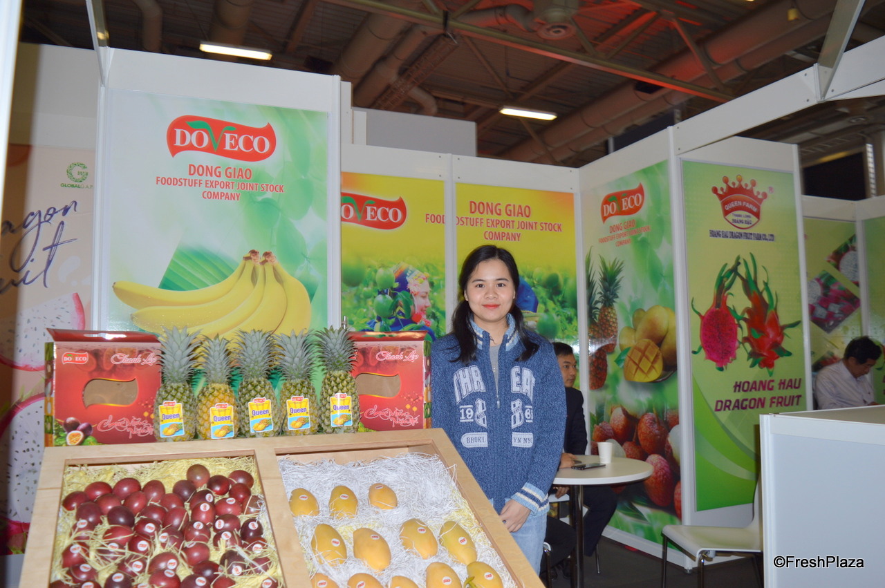 Hoang Hau Dragon Fruit Farm Co., Ltd exports a variety of fresh fruits from Vietnam, The Marketing Manager Mr Tran Ngoc Han (left) and his colleague are at the booth with their product display.