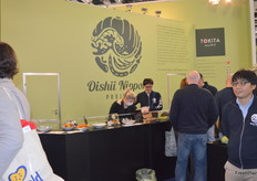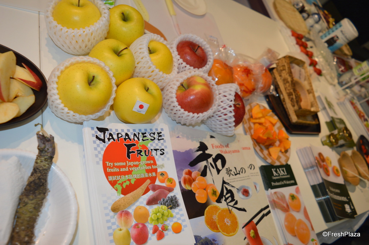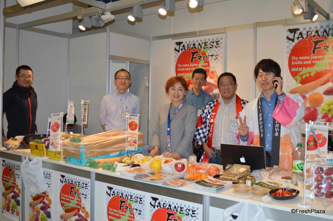 Mr Akinari Iida (general manager, 2nd on the right) is leading the Royal Co., Ltd. team. They have a small cook stand at the booth. The team is happy to see that International visitors are very interested in knowing more about Japanese fruits.