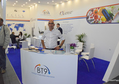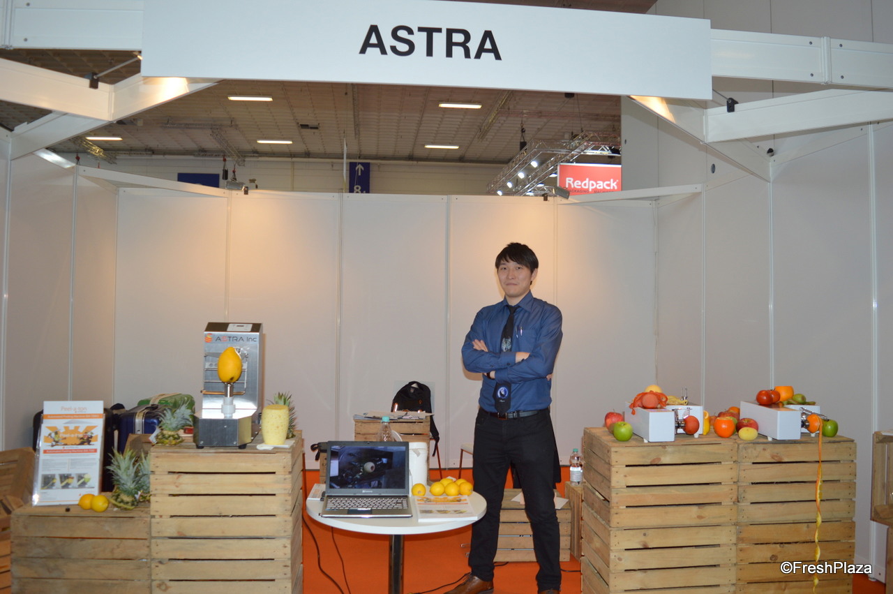 Mr Ryo Takeshita of ASTRA. The company produces a series of automates labor-intensive fruit and vegetable peeling machines. Ryo said visitors who passed his booth are all very surprised with their tomato peeling machine.