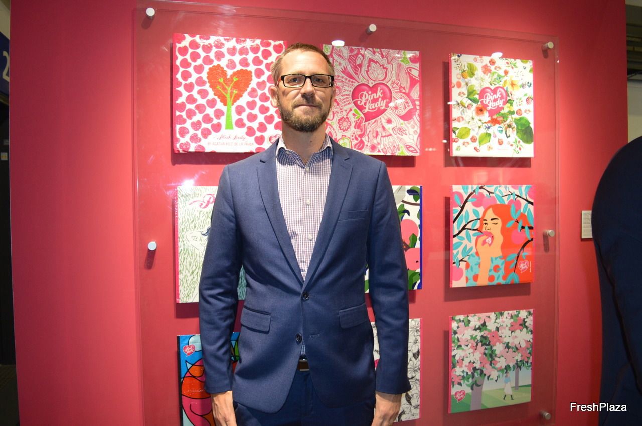 Andrew Mandemaker from Pink Lady with a back drop of the famous Pink Lady bags.