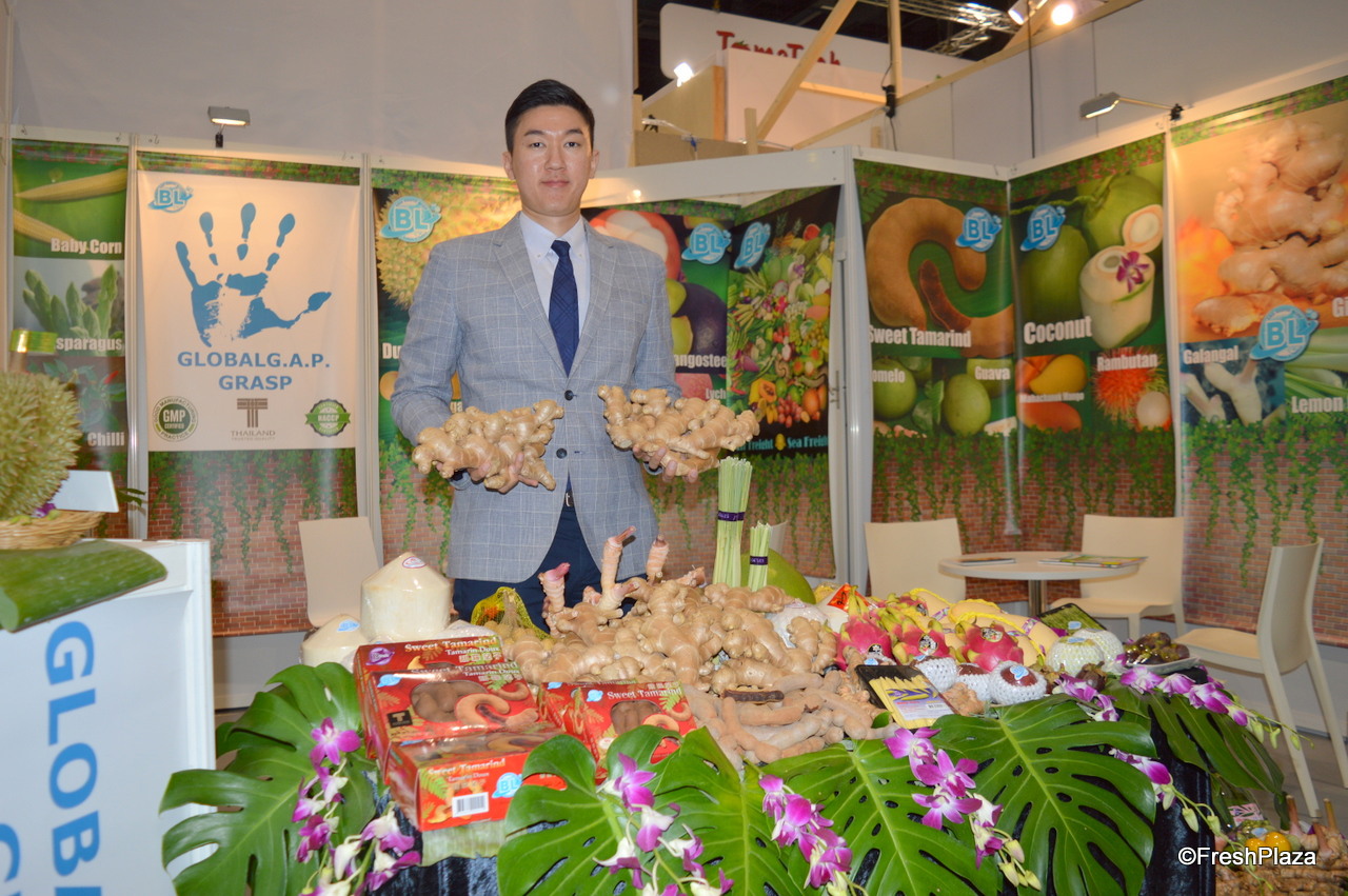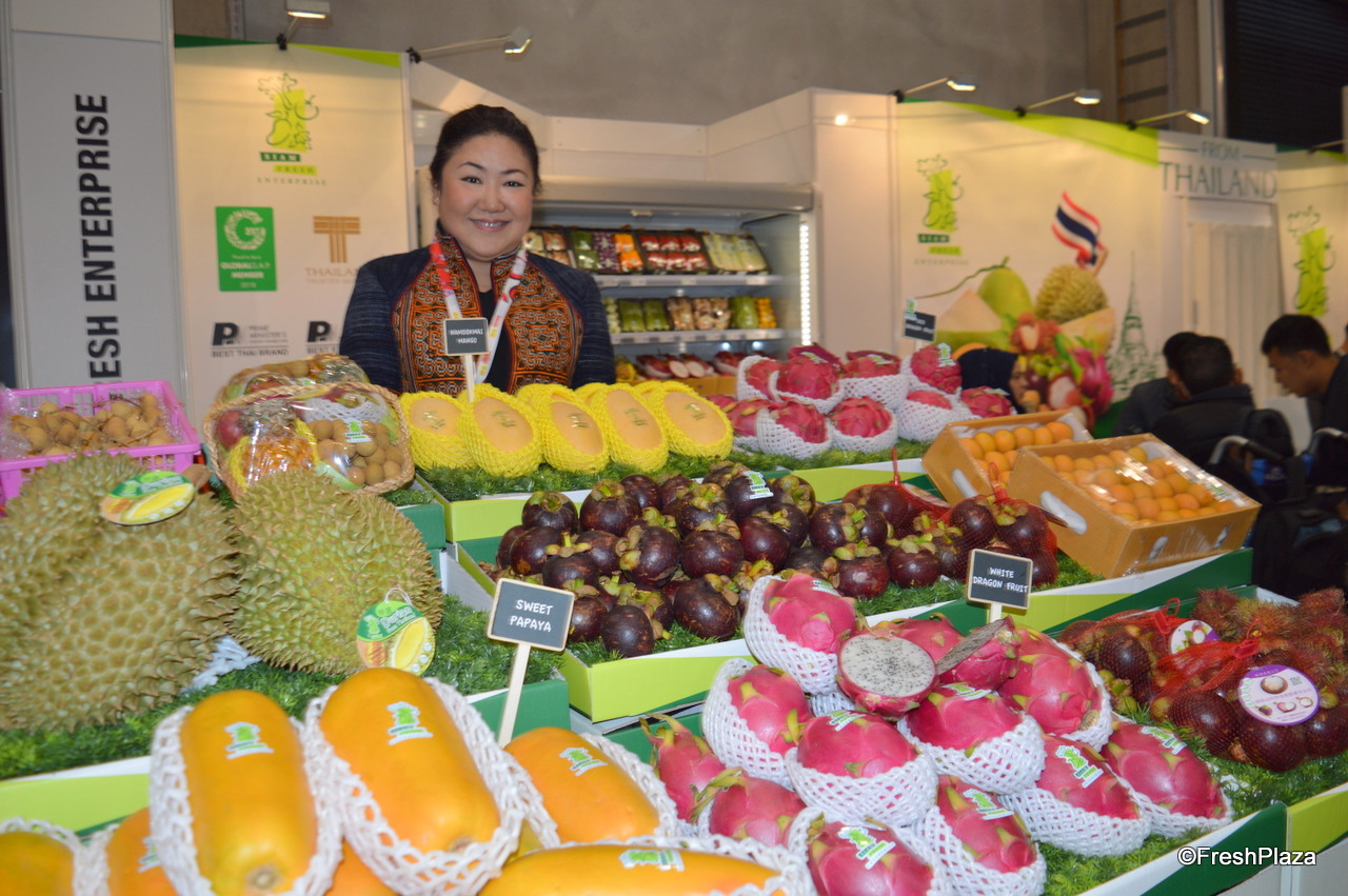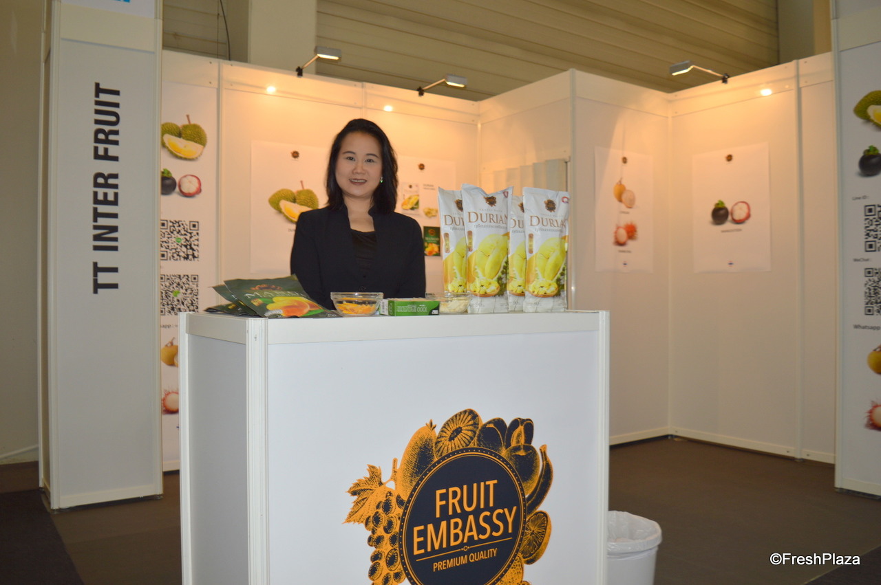 TT Inter Fruit Co., Ltd. exports a variety of tropical fruits from Thailand, including Durian, Mangosteen, Longan and Rambutan. Ms Jira-abha Krongkitjakan is proudly showing her products at the booth.