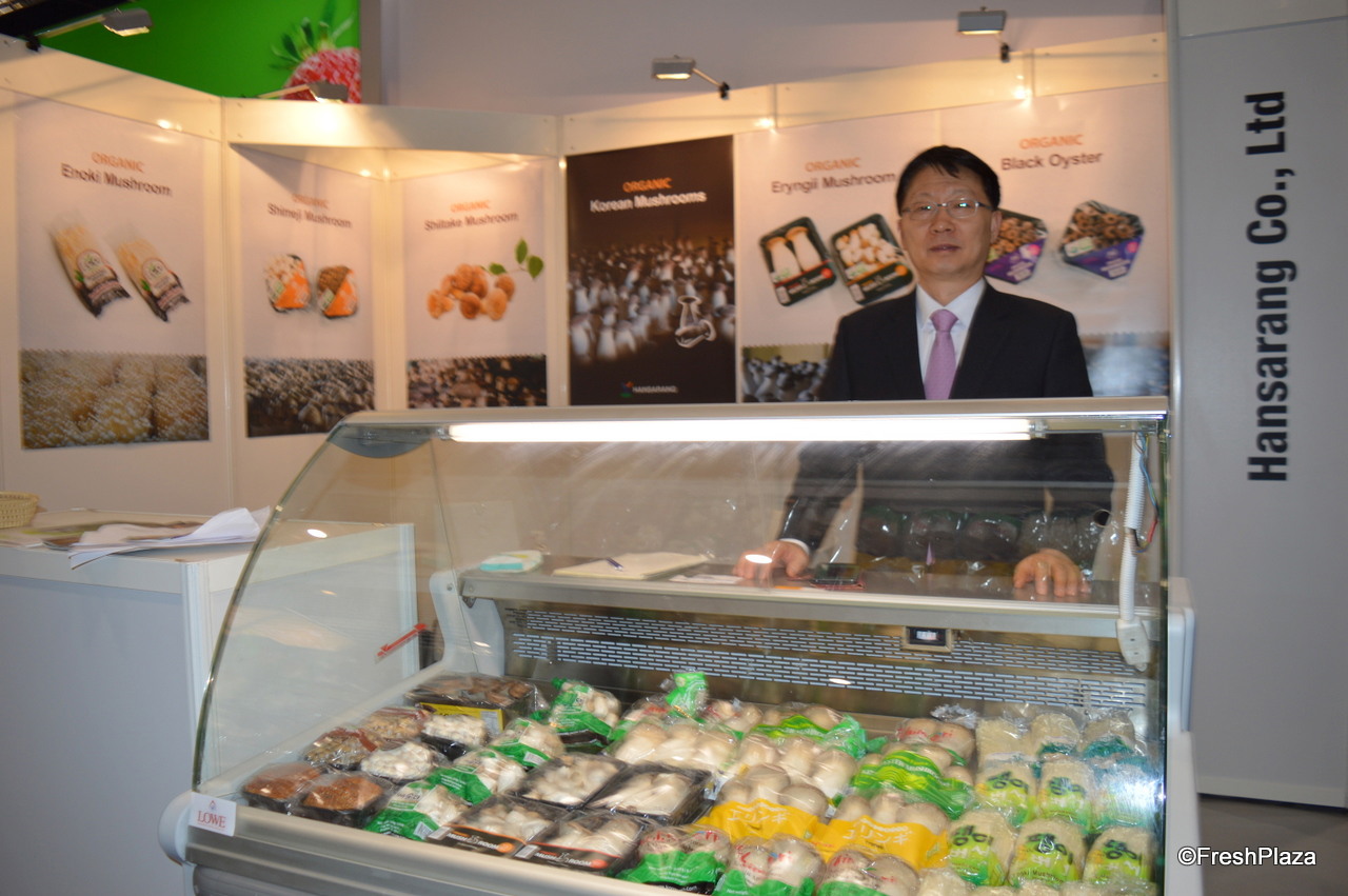 Mr Jonghae Kim of Hansarang Co., Ltd is showing a variety of mushrooms at his stand. The company has its own mushroom farm in South Korea, they mainly deal with King oyster mushroom and Enoki mushroom.