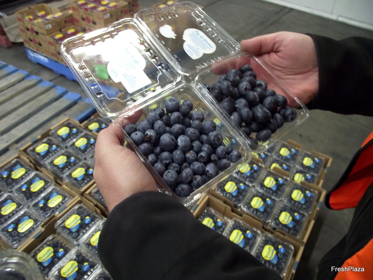 Costa Farms showing the difference between regular and jumbo-sized blueberries.