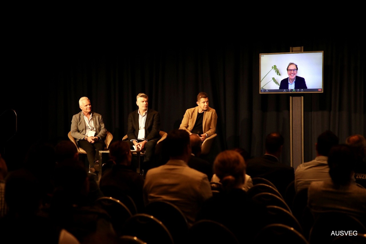 State of the Industry Panel: Paul Turner from Woolworths, Matt Brand from Hort Innovation and Tristan Harris from Harris Farm Markets, with Darren Keating (on screen) from PMA A-NZ