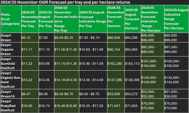 Zespri has released its November forecast for the 2024/25 season with forecast returns up across almost all categories from the last forecast in August.