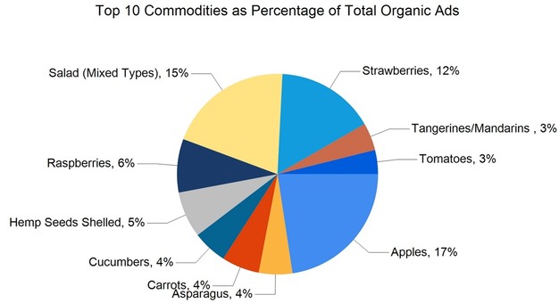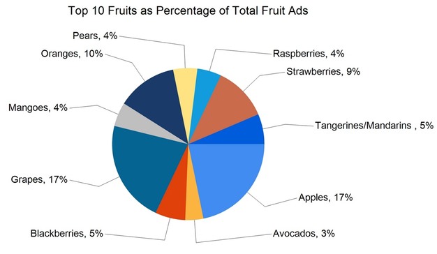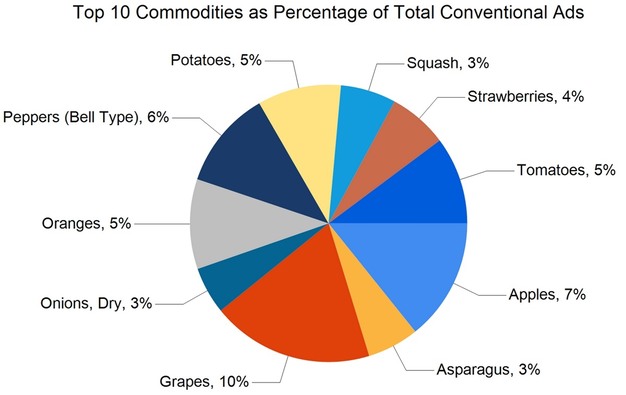 Of the total ads, 50% were for fruit (142,705), 40% for vegetables (113,168), and 7% for onions and potatoes (20,612). Herbs accounted for 1,050 ads. Ads for organic produce totaled 35,204, making up 12% of all ads.