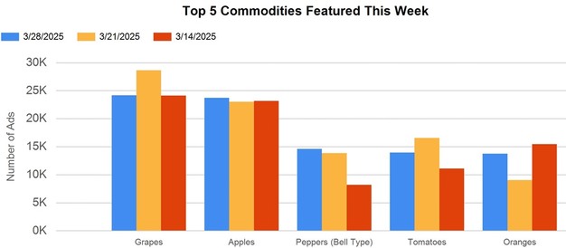 Retailers were well-prepared this week for hungry basketball and baseball fans stocking up on snacks. Popular snack tray items such as mushrooms, baby carrots, cucumbers, bell peppers, radishes, grapes, cantaloupes, strawberries, grape tomatoes, and celery were heavily advertised.