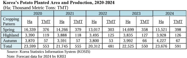 In 2024, production rose to 591,000 MT—up 7% from 2023—thanks to a 5% increase in planted area and favorable weather. Farmers chose potatoes over crops like cabbage and radishes, while others shifted to green onions due to higher prices following a poor 2023 harvest.