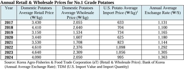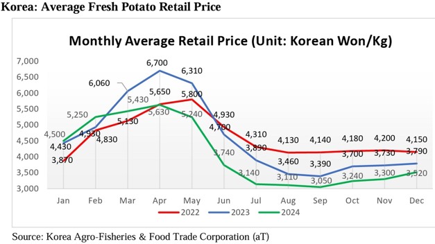 In 2024, retail and wholesale prices for fresh potatoes declined slightly due to increased output. Average retail prices fell to KRW 4,090/kg, while wholesale prices dropped to KRW 2,050/kg. Prices surged in early 2023 due to a shortage of stored potatoes but stabilized as supply improved later in the year.