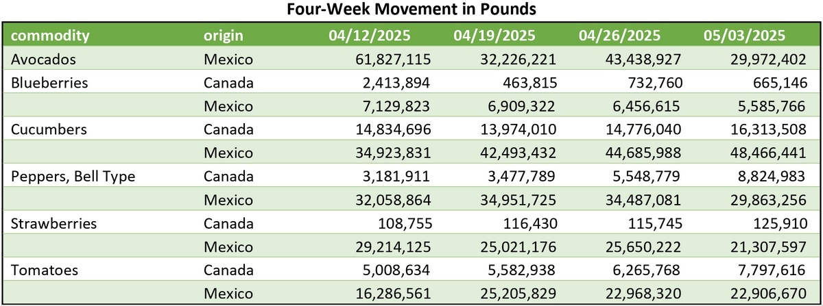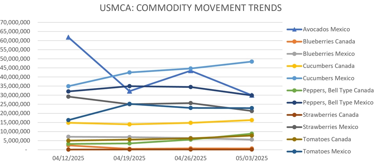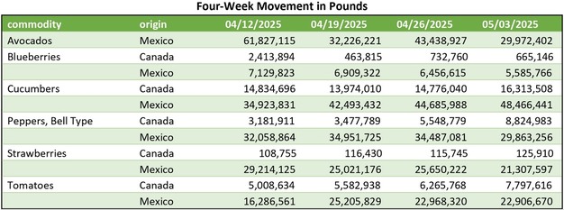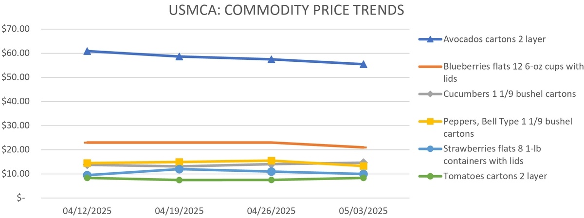 Movement from Mexico through Texas is decreasing, with early trading slow but later more active. Prices for vine-ripe 2-layer 4x4-4x5s are USD 14.95-16.95, and 5x5-5x6s are USD 9.95-10.95. In Nogales, Arizona, trading is active, with similar prices. California's Otay Mesa region expects increased movement, though current supplies are limited.