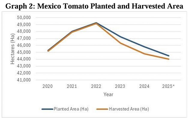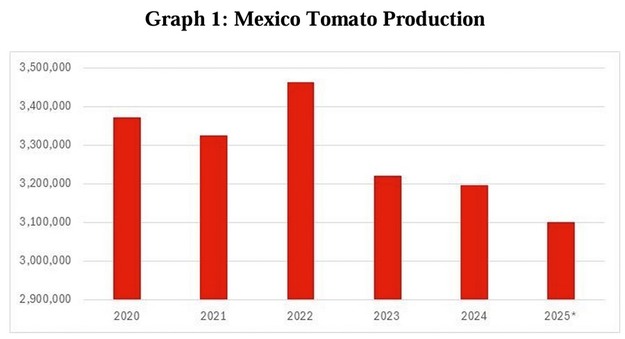 Mexico's 2025 tomato production is forecast at 3.1 million metric tons (MMT), a 3% decrease from 2024 due to persistent drought conditions, especially in Sinaloa, the country's top-producing state. Reduced planting during the autumn–winter cycle, driven by economic uncertainty and expected U.S. trade barriers, further contributes to the decline.