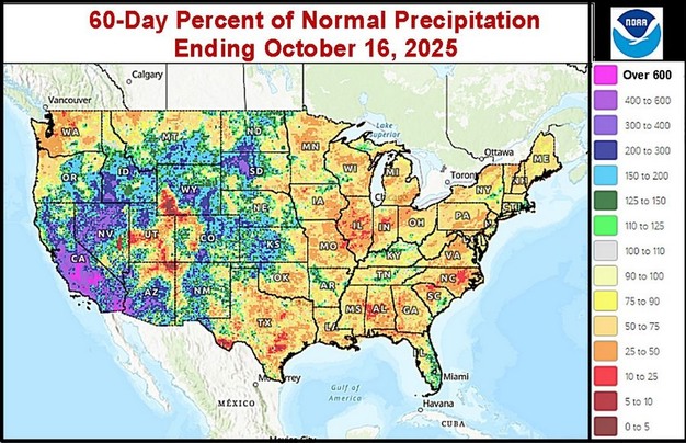 Over in California, weather has seen remarkable improvement this year with much less chronic heat. Temperatures were much kinder to fruit and vegetable development and as a result, most fruit sizes have been notably greater than those of 2024. Last year, excessive heat prevailed for a long period of time, having a significant impact on crops throughout the state. Due to more favorable conditions this year, production of most fruit, vegetable, and tree nuts is likely to be very good. Looking ahead, California precipitation in the coming winter may not be as good as it has been in recent years. While this could slightly reduce water reservoir levels for 2026, no crisis is expected.